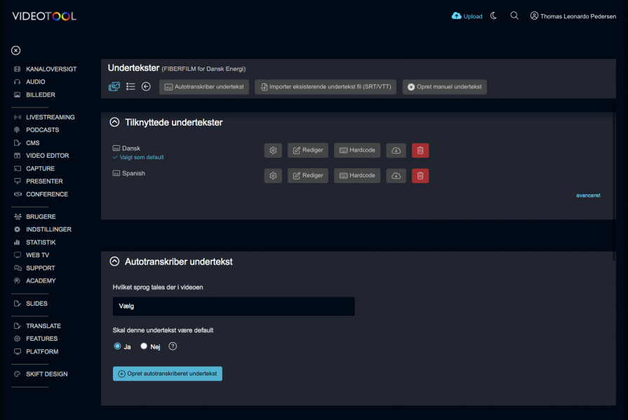 VideoTool skaber en autotransskribering af din video, og genererer en vtt tekst fil.